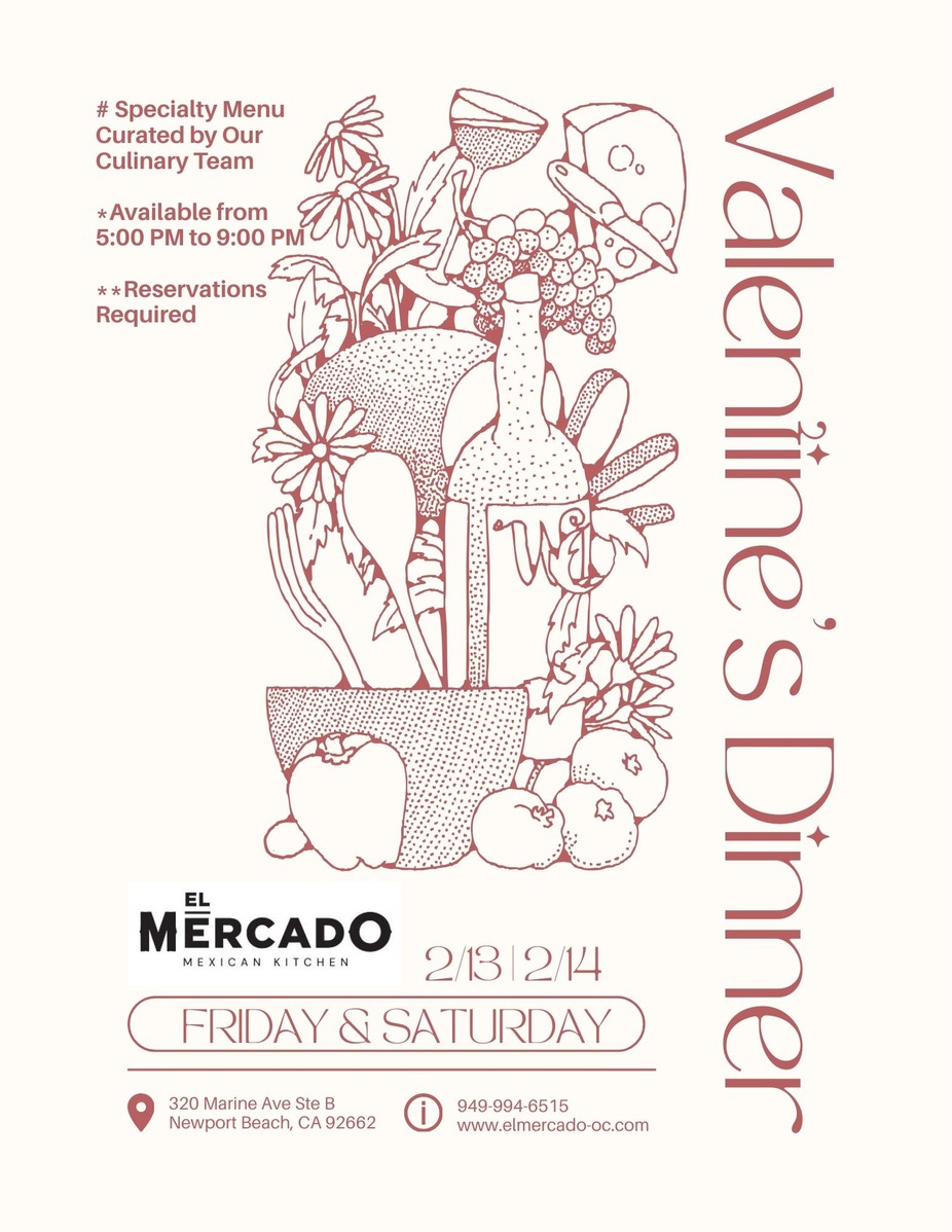 Event Details: 📍 El Mercado Mexican Kitchen 320 Marine Ave, Ste B, Newport Beach, CA 92662 📅 Friday, February 13 & Saturday, February 14 🌐 www.elmercado-oc.com